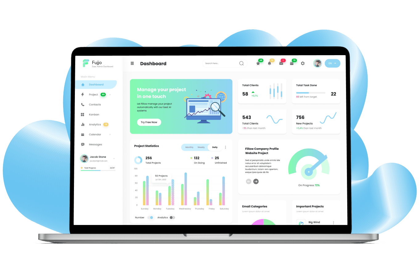 We initiated the project with a comprehensive research and discovery phase. This involved an in-depth analysis of the client's vision, objectives, and specific requirements for the app. At this stage, we also conducted thorough competitor research to identify market gaps and opportunities. Additionally, we performed a detailed audience analysis to understand the needs of project managers, team leads, and stakeholders who would be utilizing Fujjo.